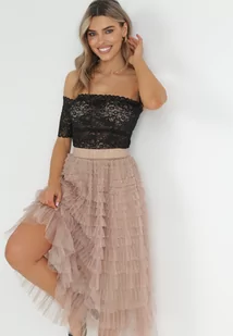 Beżowa Spódnica z Gumką w Pasie i Zdobieniami Tiulowymi Elesia