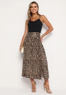 Beżowa Wiskozowa Spódnica z Wysokim Stanem i Gumką w Talii w Panterkę Vimalore