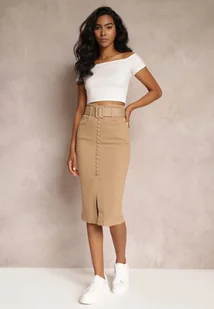 Ciemnobeżowa Jeansowa Spódnica Ołówkowa Midi z Guzikami i Rozcięciem Jackiesa