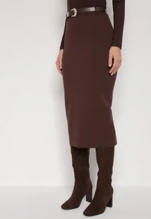 Brązowa Ołówkowa Spódnica z Wiskozą Zdobiona Rozcięciem i Paskiem Rowedela