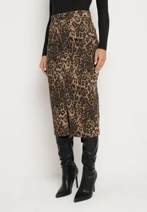 Brązowa Panterkowa Spódnica z Bawełny z Wysokim Stanem Ozdobiona Rozcięciem na Nogę Haritana