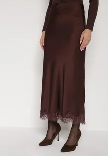 Brązowa Satynowa Spódnica z Koronkowym Zdobieniem Silfera