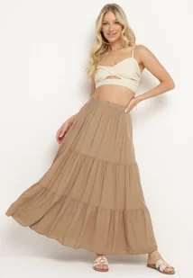 Ciemnobeżowa Rozkloszowana Spódnica z Wiskozy z Wysokim Stanem z Gumką w Pasie z Falbanką Prisella