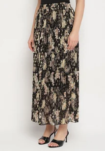 Czarna Plisowana Spódnica Rozkloszowana w Kwiaty Zdobiona Metalicznym Nadrukiem Folenisa