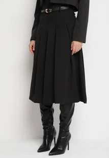 Czarna Rozkloszowana Spódnica z Wiskozą Ozdobiona Paskiem i Plisami Fidelin