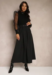 Czarna Spódnica z Wiskozą o Rozkloszowanym Kroju z Paskiem i Gumką w Talii Prianna