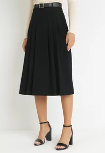 Czarna Trapezowa Spódnica Midi z Zakładkami i Paskiem z Imitacji Skóry Lorenk