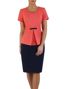 Wybierz elegancki zestaw, który połączy klasykę z nowoczesnym akcentem! Ten dwukolorowy komplet o granatowym dole i malinowej górze to doskonała propozycja na formalne okazje, spotkania biznesowe czy eleganckie wyjścia. Prosty fason podkreśli Twoją sylwetkę, a ozdobna kokarda oraz delikatne przeszycia dodają kobiecego uroku. Bluzka wyposażona jest w kontrafałdę z przodu, co wprowadza subtelną, lecz oryginalną dynamikę do stylizacji. Krótki rękaw sprawia, że jest to idealna propozycja na cieplejsze dni, a gładki tył z krytym suwakiem zapewnia komfort noszenia. Granatowa spódnica ołówkowa został