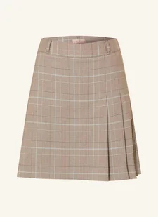 Rozkloszowany krój. Zapięcie na zamek błyskawiczny w szwie z boku. Szlufki. Zakładki z przodu. Wykończenie z podszewką. Wzór w kratę. Elastyczna bawełna