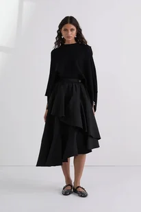 - Rozkloszowany fason. - Z tyłu zapięcie na kryty suwak. - Model z ozdobnymi falbanami. - Asymetryczna dolna krawędź.