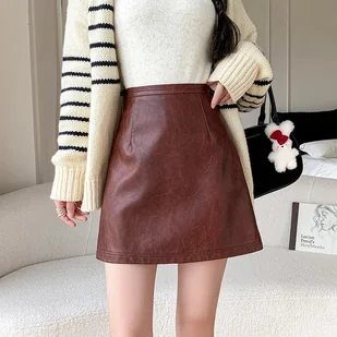 Klasyczna skórzana spódnica mini - Bordowy XL