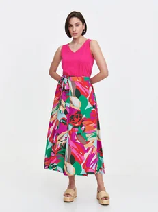 Spódnica damska Top Secret z efektowną zakładką z przodu. Ceniona za swój niecodzienny styl oraz dużą wygodę podczas użytkowania, długa rozkloszowana spódnica damska z delikatnym przeszyciem u jej dołu. Posiada ona efektowną zakładkę z przodu wraz z wiązaniem w talii z wykorzystaniem szarfy z tego samego materiału oraz praktyczną gumkę umiejscowioną w tylnej jej części. Została ona uszyta z przyjemnej w dotyku oraz dobrej gatunkowo dzianiny, będąc wzbogaconą o barwny nadruk na całości z motywem ręcznie malowanych kwiatów. Może być ona wykorzystana zarówno jako element niecodziennej stylizacji do pracy, jak i też podczas weekendowych wypraw w gronie przyjaciół.