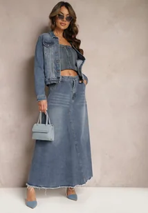Niebieska Trapezowa Spódnica z Bawełny Jeansowa Ozdobiona Paskiem i Strzępieniami na Dole Meraleo