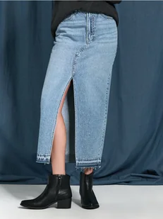 Sinsay - Jeansowa spódnica - niebieski - długość maxi,rozcięcie z przodu,surowe wykończenie dołu,2 kieszenie z przodu i z tyłu,zapięcie na suwak i guzik,szlufki do paska,100% bawełna