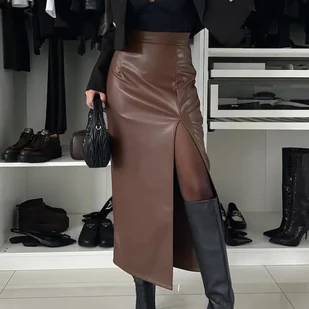 Skórzana spódnica midi z rozcięciem - Brązowy