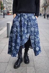Spódnica damska asymetryczna midi w kwiaty granatowa Uniwersalna Spódnica Damska Asymetryczna Midi w Kwiaty Granatowa Uniwersalna Odkryj spódnicę midi, która łączy artystyczny, kwiatowy print z niezwykłą wygodą i surowym wykończeniem. To nie tylko baza garderoby, ale wyrazisty element stylizacji, stworzony dla kobiet poszukujących balansu między swobodą a niebanalnym designem. Wykonana z ciemnego denimu zdobionego białymi motywami florystycznymi, przyciąga wzrok surowym wykończeniem i dynamicznym wycięciem z przodu. Elastyczny pas oraz praktyczne kieszenie gwarantują perfekcyjne dopasowanie i pełną swobodę ruchów. To wyrazista i uniwersalna baza, która nada charakteru zarówno codziennym stylizacjom z botkami, jak i odważniejszym, miejskim zestawom.