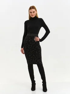 Spódnica damska Top Secret dzianinowa ołówkowa. Ołówkowa spódnica damska o długości przed kolano, która przylega do kobiecej sylwetki i eksponuje jej walory. Posiada ona praktyczną szeroką gumkę w talii oraz efektowny nadruk na całości z motywem orientalnym, do którego wykonania wykorzystano metalizowaną nitkę. Została ona wykonana z przyjemnej w dotyku oraz dobrej gatunkowo dzianiny, będąc cenioną za oferowane ciepło oraz miękkość. Może być ona wykorzystywana zarówno jako element stylizacji oficjalnej do pracy, jak i również podczas weekendowych spotkań z przyjaciółmi.