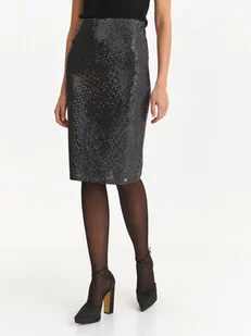 Spódnica damska Top Secret ołówkowa błyszcząca. Efektowna ołówkowa spódnica damska o długości przed kolano, która przylega do kobiecej sylwetki i eksponuje jej walory. Jest ona zapinana z tyłu na chowany suwak, a uroku dodaje jej rozcięcie z tyłu pośrodku. Została ona wykonana z dobrej gatunkowo oraz trwałej dzianiny z dodatkiem metalizowanej nitki, ujmując swym niecodziennym połyskiem na całości. Z powodzeniem można ją wykorzystywać zarówno jako element kobiecej stylizacji do pracy, jak i również podczas uroczystej kolacji ze znajomymi.