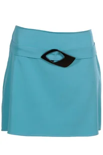 Mini spódniczka, biodrówka, w kształcie trapezu. Skrojona po skosie. Uszyta została z tkaniny. Zarówno z przodu jak i z tyłu wąski karczek. Na przodzie, na linii karczka ozdobny pasek z plastikową klamrą.