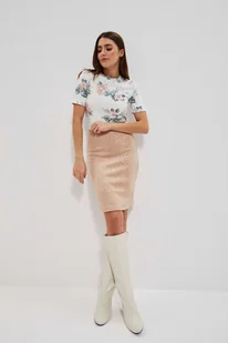 95%POLIESTER, 5%ELASTAN Elegancka, beżowa spódnica o prostym kroju. Na całości tłoczony deseń w kwiatki. W pasie, od spodu wszyta guma. Długość przed kolano....