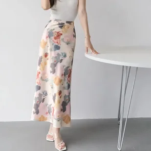 Spódnica satynowa maxi we wzory - Kremowy L