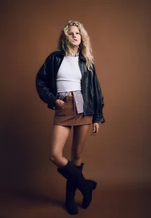 Spódnico-spodnie mini wykonane z tkaniny imitującej zamsz. Średni stan i pas ze szlufkami. Kieszenie z przodu i naszywane kieszenie z tyłu. Zapięcie z przodu na zamek błyskawiczny i metalowy guzik. Wewnętrzna podszewka typu szorty.