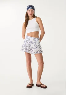 Zwiewna spódnico-spodnie ze średnim stanem z detalami haftowanych, ażurowych wzorów w kontrastowych kolorach. Wewnętrzna podszewka typu spodenki. Boczne zapięcie na kryty zamek w szwie.