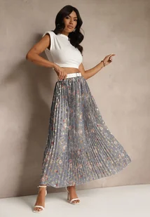 Szara Kwiecista Spódnica Rozkloszowana z Plisami Zdobiona Metalicznym Nadrukiem Folonissa