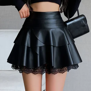 TEMU Damska spódnica z wysokim stanem, wykończona koronką - stylowa czarna mini spódnica na wiosnę i , zapinana na zamek błyskawiczny, można prać w