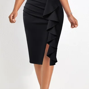 TEMU Damska wysoka, ruchowana spódnica midi - czarna, jednokolorowa, płynny design, idealna do codziennego lub biurowego noszenia, stylowa i swobodna