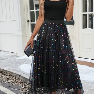 TEMU Elegancka, kolorowa spódnica damska w kropki z siateczki, z elastyczną talią, idealna na imprezy modowe i wieczory.