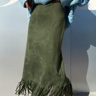 TEMU Elegancka Oliwkowa Spódnica Maksymalna z Frędzlami - Całoroczny Płynący (chwost) w Kształcie półokręgu, Pranie Maszynowe, Uniwersalne na Styl