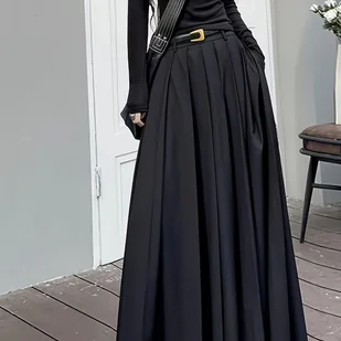 TEMU Elegancka Spódnica Maksymalna w Kształcie Litery A z Wysokim Stanem i Plisowanym Dołem z Wieloma Paskami - Jednolity Brąz - Długość