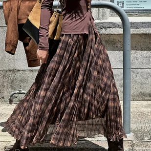TEMU Elegancka Spódnica Midi w Stylu Koreańskim dla Kobiet - Wzór w Kratę (Brązowy/Beżowy), Bez Paska, Możliwość Prania w Pralce, Spódnica na Zimę i