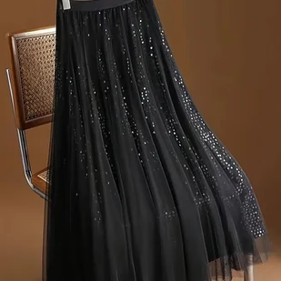 TEMU Elegancka spódnica midi z tiulu z cekinami - Wysoki stan, wyszczuplająca dzianina poliestrowa, jednolity wzór, długa, rozkloszowana spódnica dla