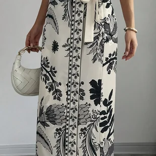 TEMU Elegancka Spódnica Prosta z Kwiatowym Nadrukiem i Wiązaniem, Styl Wakacyjny dla Kobiet