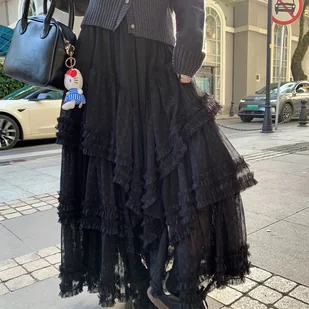 TEMU Spódnica A-line o średniej długości z wysokim stanem, wykonana z gazy koronkowej, inspirowana ciastem pomponowym.