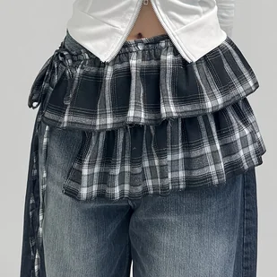 TEMU Mini Spódnica w Kratę Czarno-Białą z Falbankami i Regulowanymi Wiązaniami Boczne - Letni, Casualowy Strój na Wakacje, Tkanina Nieelastyczna do
