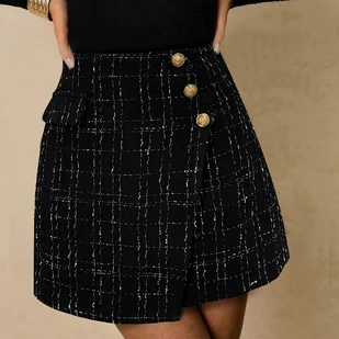TEMU Seksowna spódnica damska w kratę z metalicznymi guzikami - z wysokim stanem, falbanką u dołu, czarno-biała kratka, idealna na jesień, od stroju