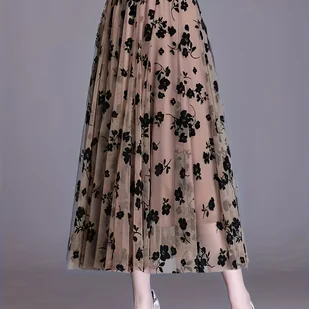 TEMU Spódnic Damskich w Kolorze Kawy z Siatki - Pranie Maszynowe, Elegancki Design, Duże Plisowane Wzorce, Nowość na Sezon: /Wiosna/Jesień, Stylowa i