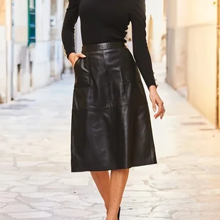 TEMU Elegancka spテウdnica midi z wysokim stanem z imitacji skテウry dla kobiet - jednokolorowa czarna, z rozszerzonym krojem i detalami z zamka