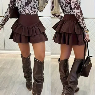 TEMU Spódnica Damska Wysoki Stan, Jednokolorowa z Falbanką, Modna i Uniwersalna z Elastycznym Pasem i Rozkloszowanym Dołem, Słodka i Urocza Spódnica