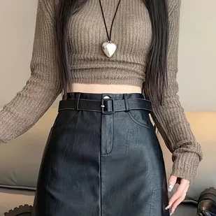 TEMU Czarna Wysokotalia Wąska Spódnica z Ekoskóry w Stylu Vintage