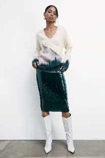 Spódnica midi z tiulu, w całości haftowana połyskującymi, iryzującymi cekinami – glam-rockowy element, który łączy prostą linię z wyrafinowanym wykończeniem. Idealna, by rozświetlić wieczorowe stylizacje, ale sprawdzi się też na co dzień w duecie z oversize’owym swetrem i kozakami crinkle.