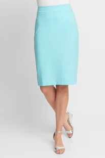 Turkusowa spódnica w ołówkowym fasonie. Gładki przód i zapięcie na suwak sprawią, że materiał płasko i elegancko ułoży się na sylwetce. Spódnica ma jednolity, turkusowy kolor. Będzie świetną podstawą do budowania kolorowych stylizacji. Założ do niej wzorzystą bluzkę z głębokim dekoltem.