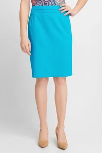 Lazurowa spódnica z ozdobnym paskiem. Prosty krój pozwoli ci na swobodę ruchów i wygodę użytkowania. Spódnica uszyta jest z wytrzymałego, przyjemnego dla skóry materiału. Dzięki jednolitej kolorystyce dopasujesz ją do wzorzystych bluzek. Płaska na biodrach, spódnica z przodu ma podwójne, ozdobne przeszycie na pasku.