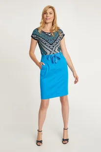 Dwie kieszenie na biodrach otwierają się na boki, są wpuszczone w materiał. Spódnica kończy się nad kolanami, ma lekko zwężany fason. Do głębokiego, niebieskiego koloru dobierz jasne buty na obcasie i żółtą bluzeczkę ze wzorkiem.