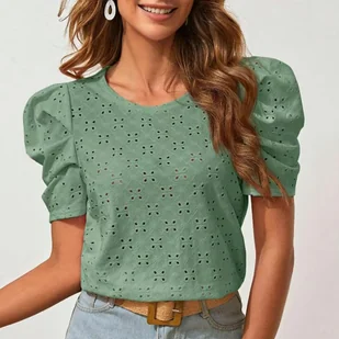 Ażurowy damski top z marszczonymi rękawami - Zielony