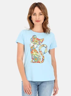 Bawełniana bluzka damska z kolorowym nadrukiem kota Nasza niebieska bawełniana bluzka z kotem to kwintesencja wyrafinowanego stylu i uroku. Wzór ozdobiono cy...
