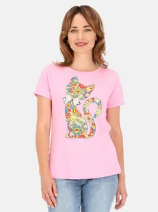 Bawełniana bluzka damska z kolorowym nadrukiem kota Świetną propozycją na tegoroczne lato jest różowa bawełniana bluzka z kotem. W tę wyjątkową koszulkę wple...